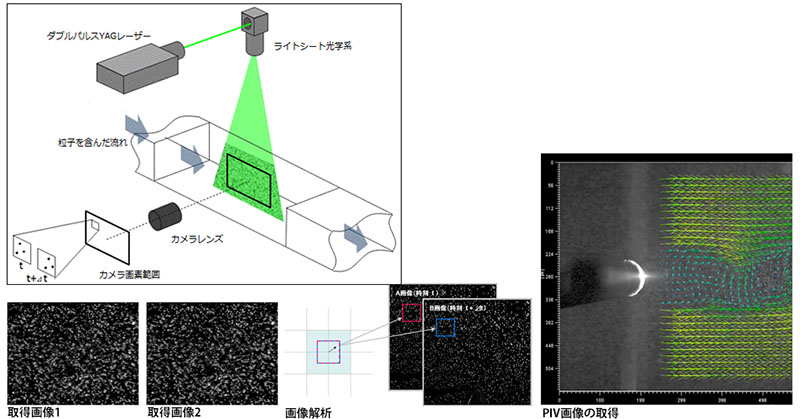 基本原理は、まず測定すべき流れを視覚化するために、小さな粒子を散布します(シーディング)。この時に形成された流れ場内の測定領域に対して、ダブルパルスYAGレーザーなどのレーザー光源を、シート状に生成する専用の光学系を通じて、シート光として照射します。そして、照射タイミングに合わせてダブルシャッターカメラで2枚連続で画像を取得します。 ダブルパルスレーザーとダブルシャッターカメラは、非常に短い時間間隔、例えば100μ秒未満の2つの粒子画像を記録するように同期されます。解析ソフトでは、取得された画像内の個々の粒子を識別することで、移動量と移動速度の両方を算出します。